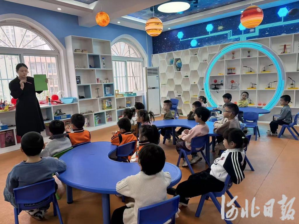 邢台市襄都区第二幼儿园教师向幼儿讲解实验原理。