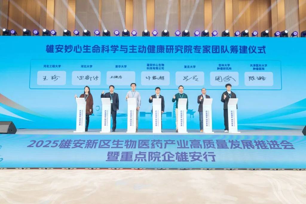 为推动产学研医金服等各方力量凝心聚力,会上发布了“雄安新区生物医药产业高质量发展战略合作倡议”,呼吁各方合力健全创新链、做强产业链、共筑人才高地、打造国际合作枢纽;举行了“雄安妙心生命科学与主动健康研究院(筹)发起仪式”,该研究院旨在构建一个汇聚顶尖科学家、赋能专业人才、促进科研创新与成果转化的综合性平台。