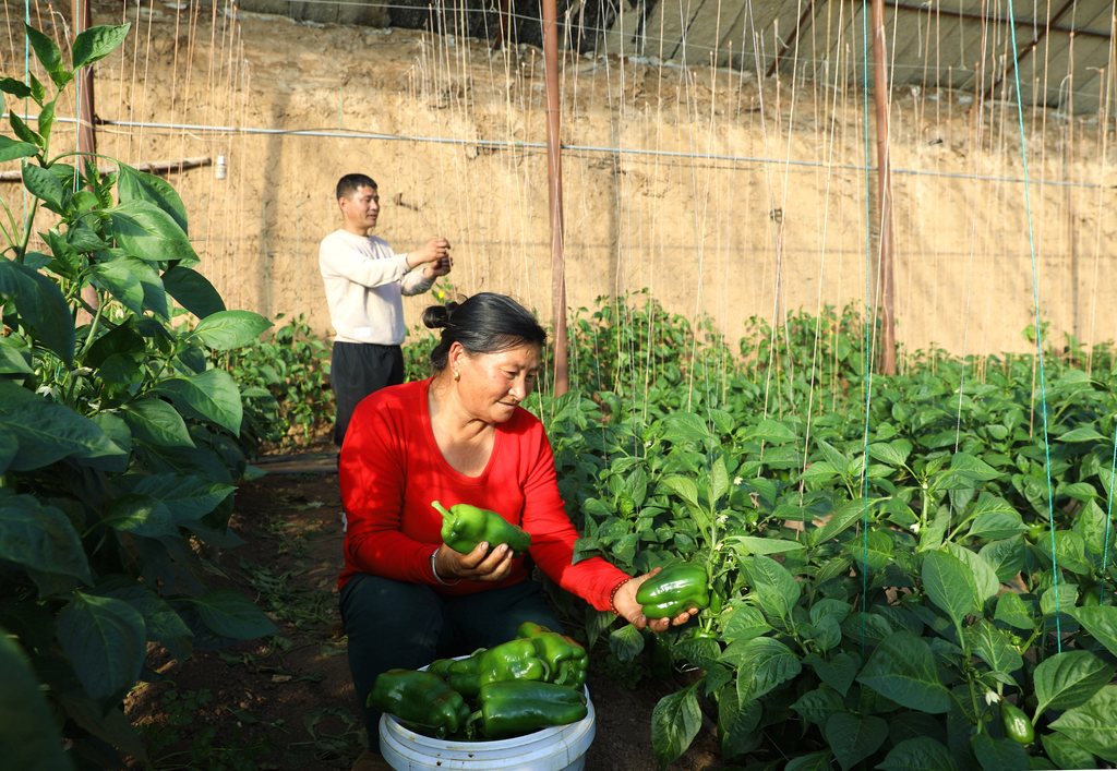 平泉市平泉镇农民正在温室棚内采摘辣椒。