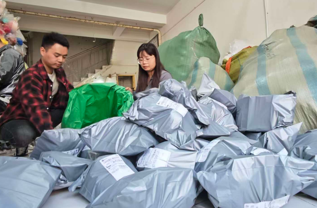 雄安新区容城县晾马台镇的雄安北方毛绒玩具城内,盈曦小店店主夫妻俩打包货品,准备发往全国各地。