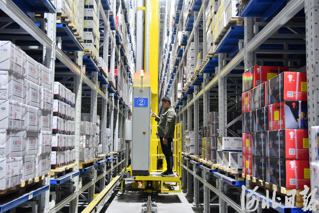 在邯郸市永年区工业园区,工人在智能仓储车间装卸货物。胡高雷摄