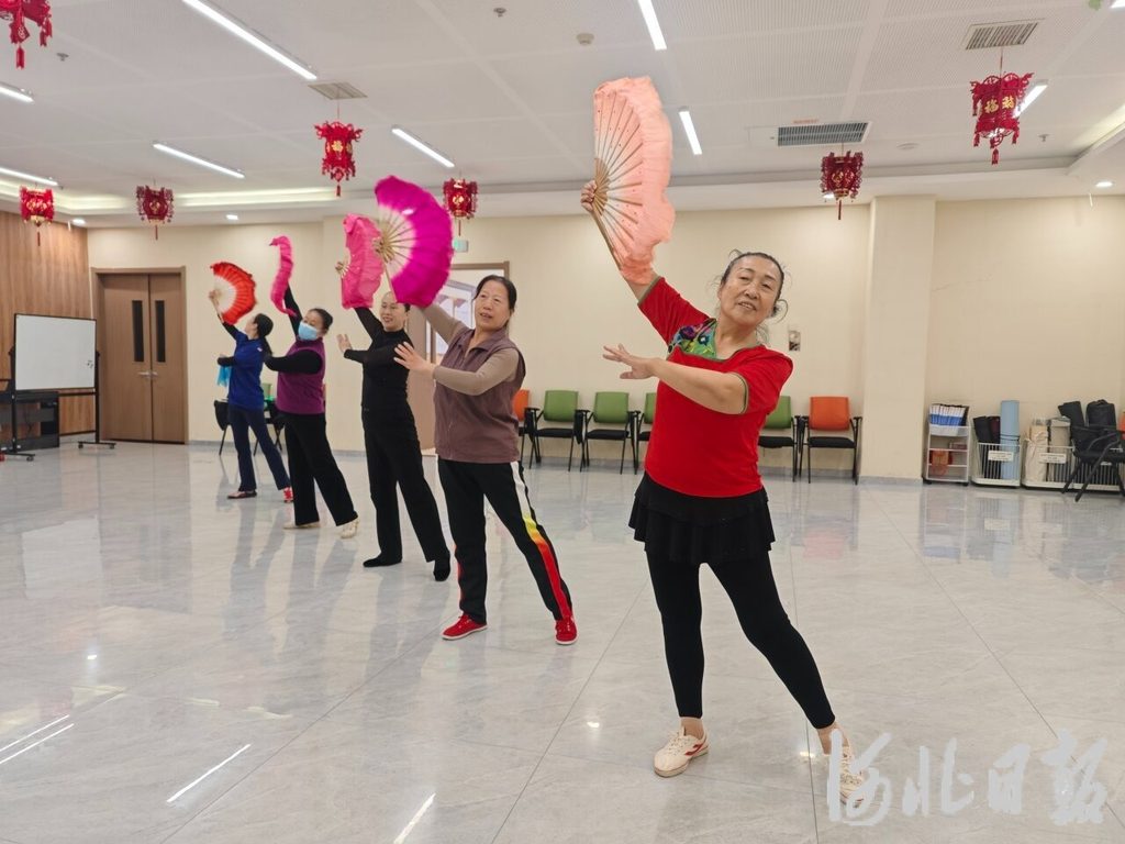 10月22日,石家庄市裕华区裕东街道区域养老服务中心内,高新区蓝天舞蹈队队员们正在排练舞蹈。 河北日报见习记者屈玉琪摄