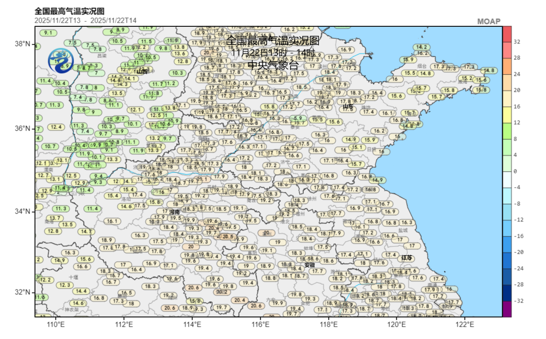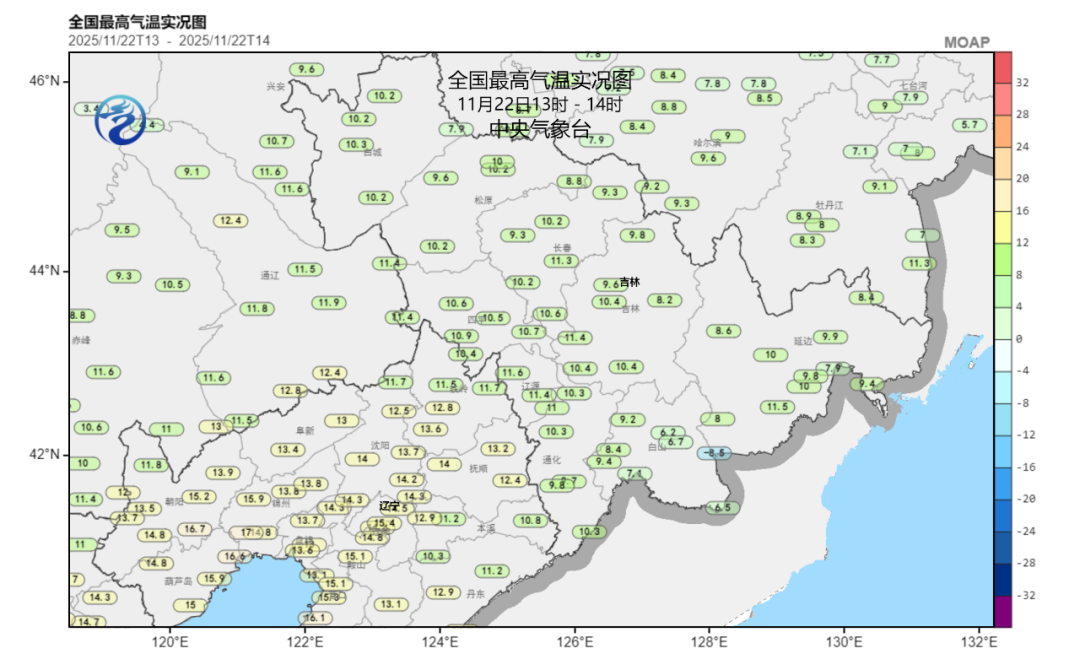 14时左右,沈阳14.3℃,石家庄19.5℃、郑州18.2℃都比常年同期显著偏暖。