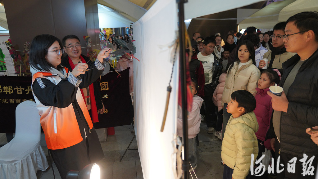 11月22日,第十九届中原民间艺术节在邯郸道历史文化街区开启,一名游客在非遗文创展上体验皮影戏。董源摄