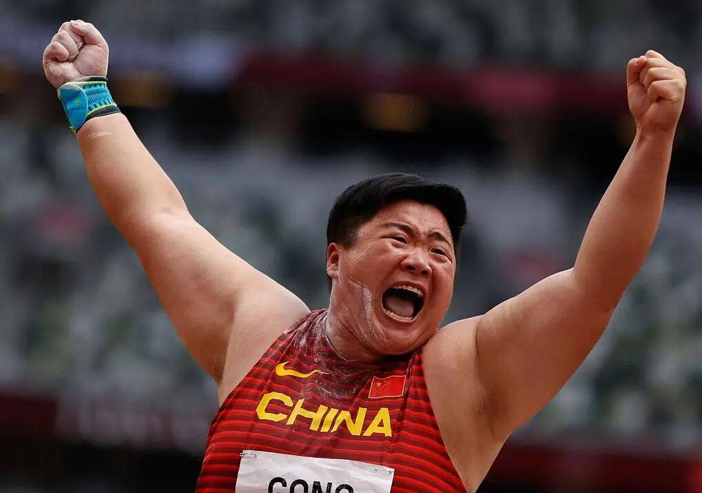 2021年8月1日,巩立姣在东京奥运会田径女子铅球决赛后庆祝胜利。(新华网)