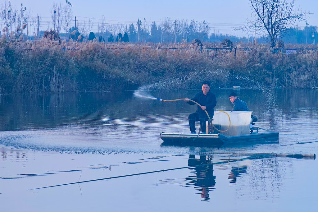 11月14日,沧州市盐山县庆云镇后簸箕村北的坑塘水波轻漾,一片静谧。村党支部书记邓海亮走上饲喂台,启动投喂设备。就在他完成操作的瞬间,饲喂台周围的水面骤然涌动——成群的鱼从四面八方汇聚而来。不多时,整个水面仿佛沸腾,鱼影交错,水花四溅。
