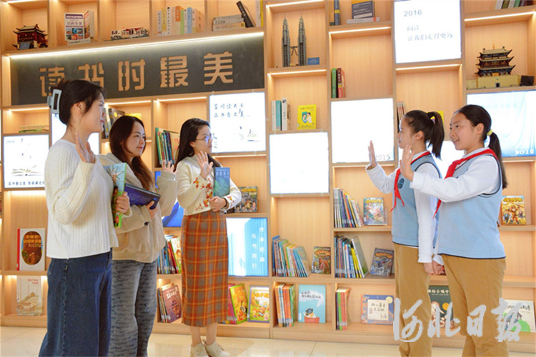11月20日,在石家庄市柏林庄学校,同学和老师们在阅读长廊互相问候。