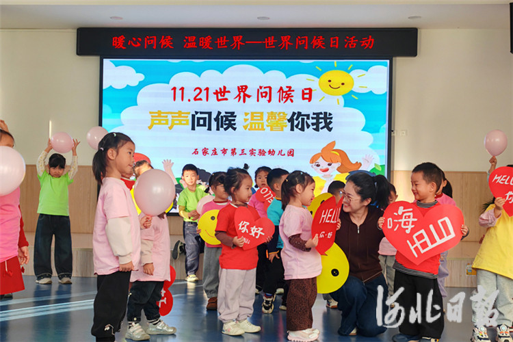 在“世界问候日”来临之际,石家庄市新华区多所小学、幼儿园开展丰富多彩的主题活动。孩子们通过问候礼仪演练、手绘祝福卡片、温情寄语分享等形式,学习文明表达、传递善意,在互动中涵养和善品格、践行文明行为,让问候之暖浸润校园每个角落。