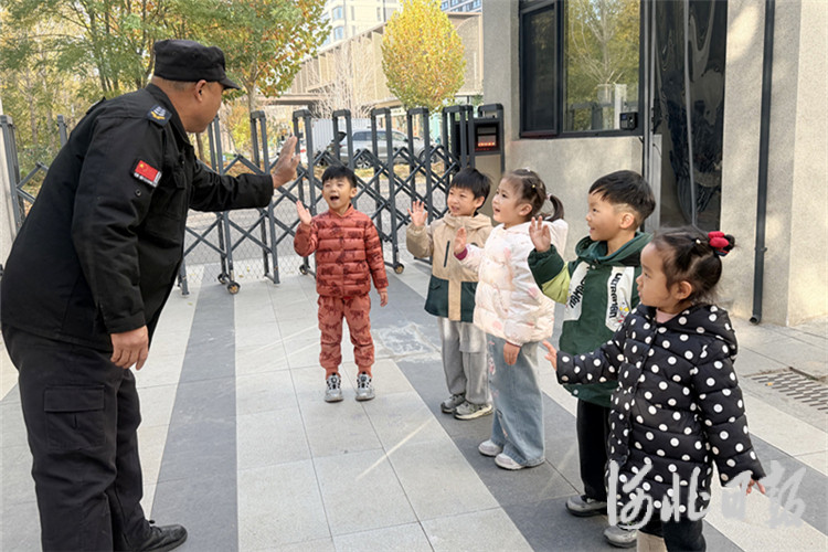 11月20日,在石家庄市华北幼儿园,小朋友们来到幼儿园向保安师傅打招呼。