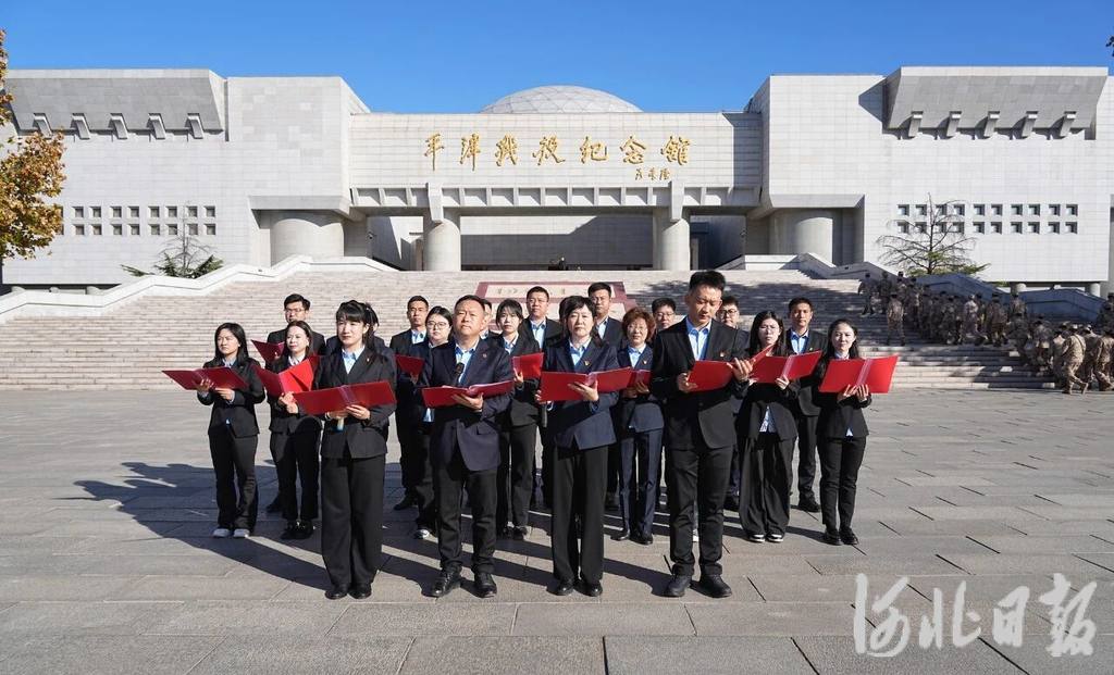 曹妃甸职业技术学院党员代表在平津战役纪念馆前进行集体朗诵。