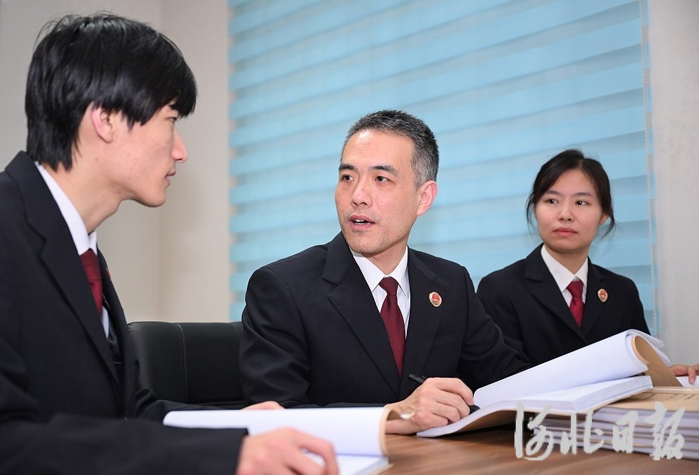 11月14日,李硕(中)与同事在讨论案件。河北日报记者史晟全摄