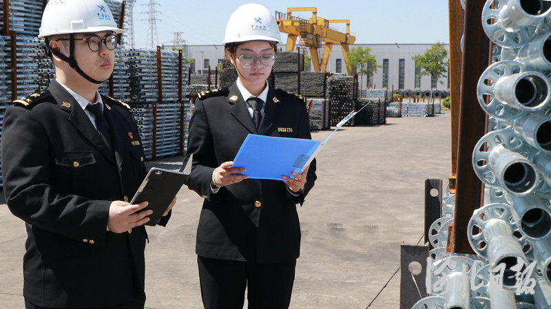 图为京唐港海关关员对出口盘扣脚手架进行属地查检。