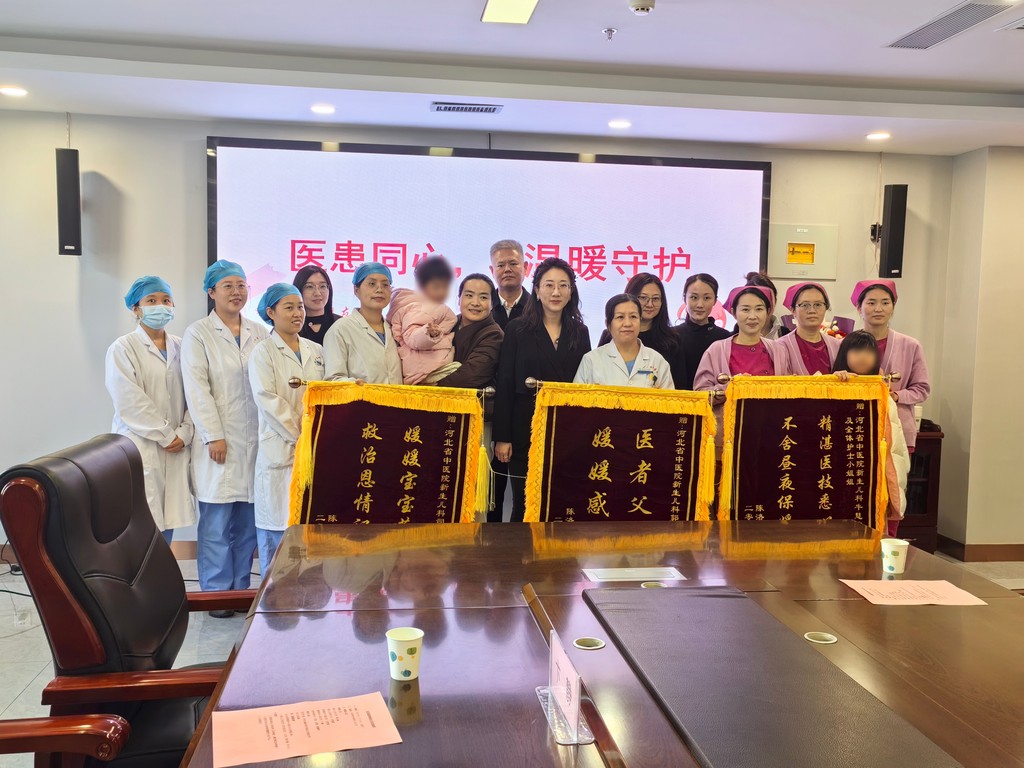 陈先生夫妇带着女儿小媛媛将三面锦旗分别送到河北省中医院新生儿科科主任郭志梅、护士长牛慧霞、医生司丽英手中。河北省中医院供图