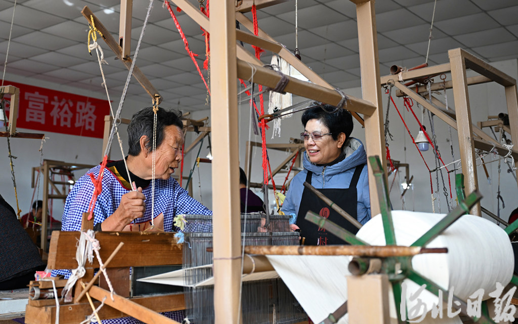 11月10日,赞皇原村土布纺织技艺第三代传承人崔雪琴(右)在非遗工坊与织娘交流。河北日报记者赵永辉摄