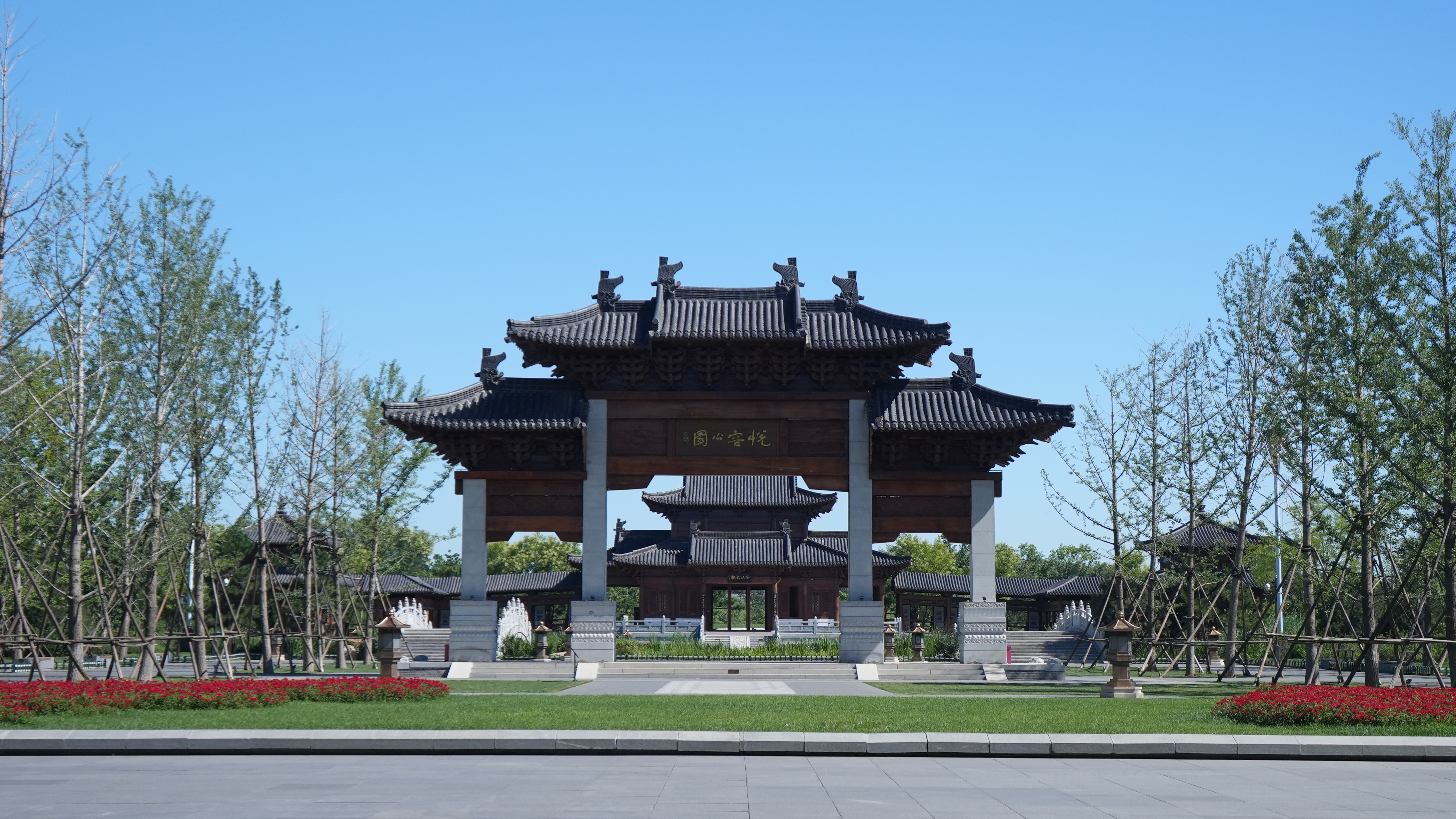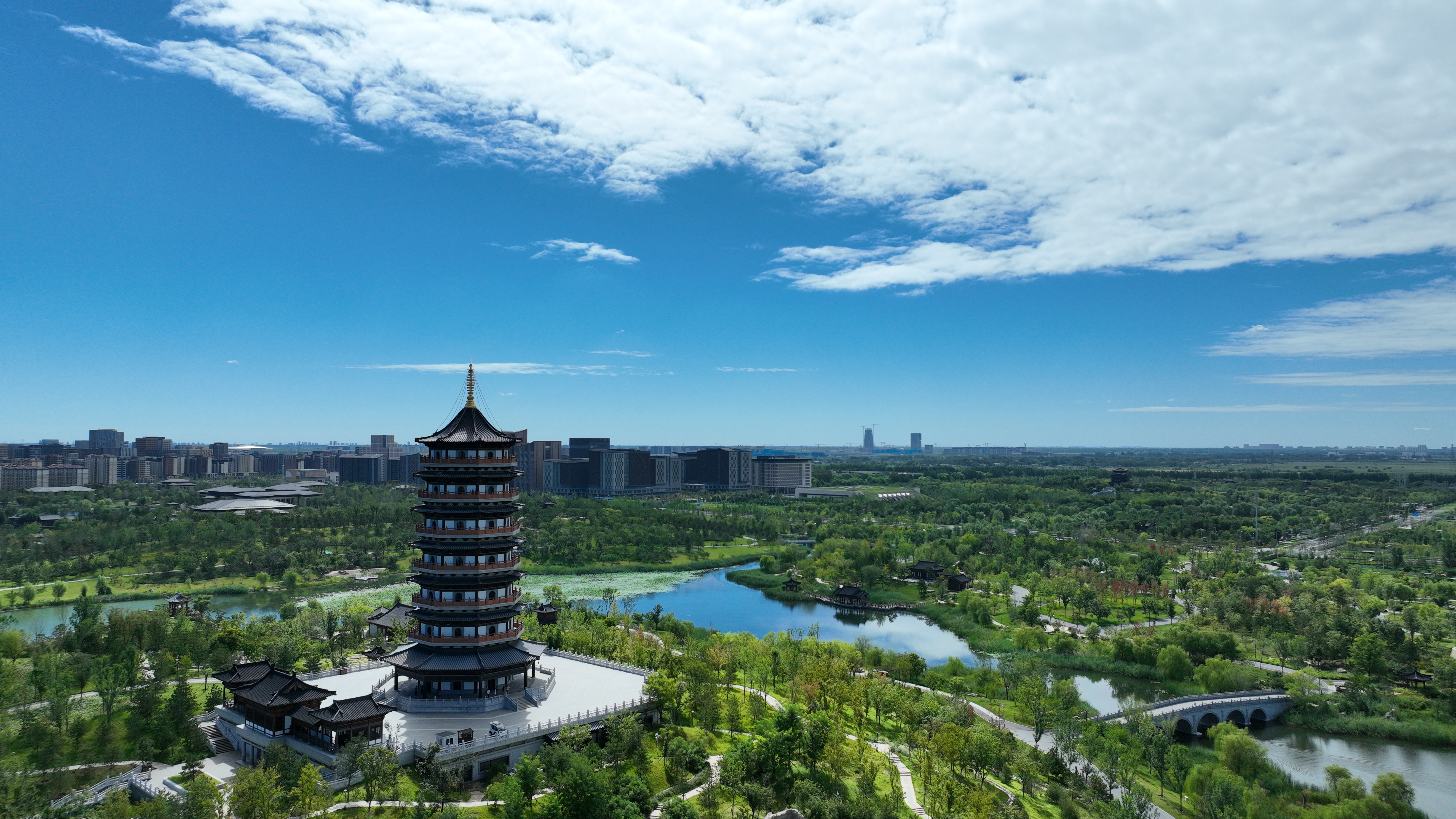 悦容公园融合传统园林艺术与现代生态理念:北苑再现《诗经》“关关雎鸠,在河之洲”的意境;中苑以塔为核,绘就大地诗画;南苑庄重有序,尽显古典园林风貌。