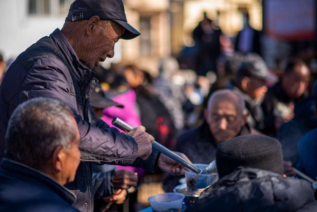 枣强县马屯镇东良党村的村干部为老人们端菜。张树伟摄