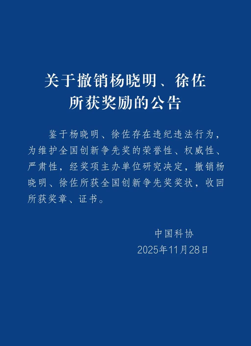 中国科协:杨晓明、徐佐存在违纪违法行为,撤销所获奖励