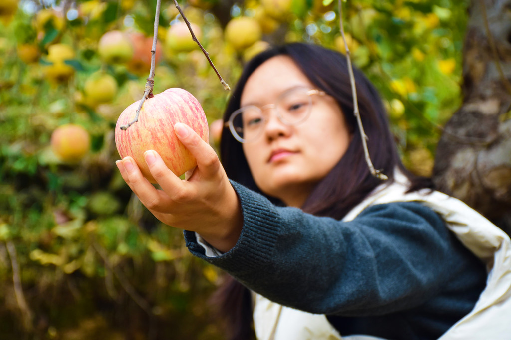 11月10日,游客在临城县阎家庄村苹果种植基地采摘苹果。