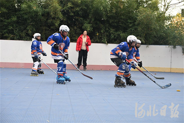 11月26日,在石家庄市柏林庄学校,学生们在轮滑冰球场地进行冰球比赛。