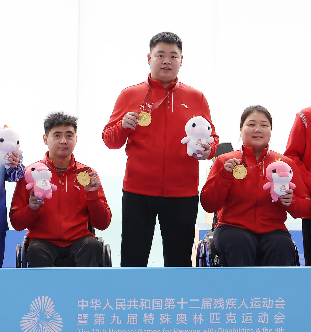11月29日,全国第十二届残运会射击比赛在SH1级混合50米口径步枪卧射团体比赛,由张翠平、任博、许建杰(中)组成的河北队获得金牌。