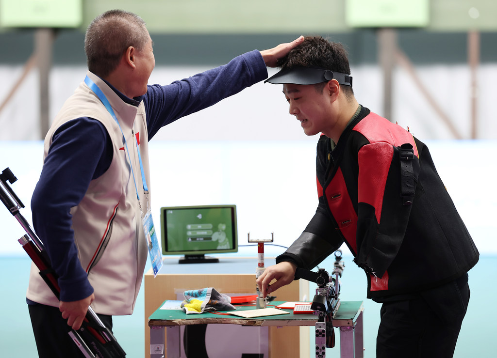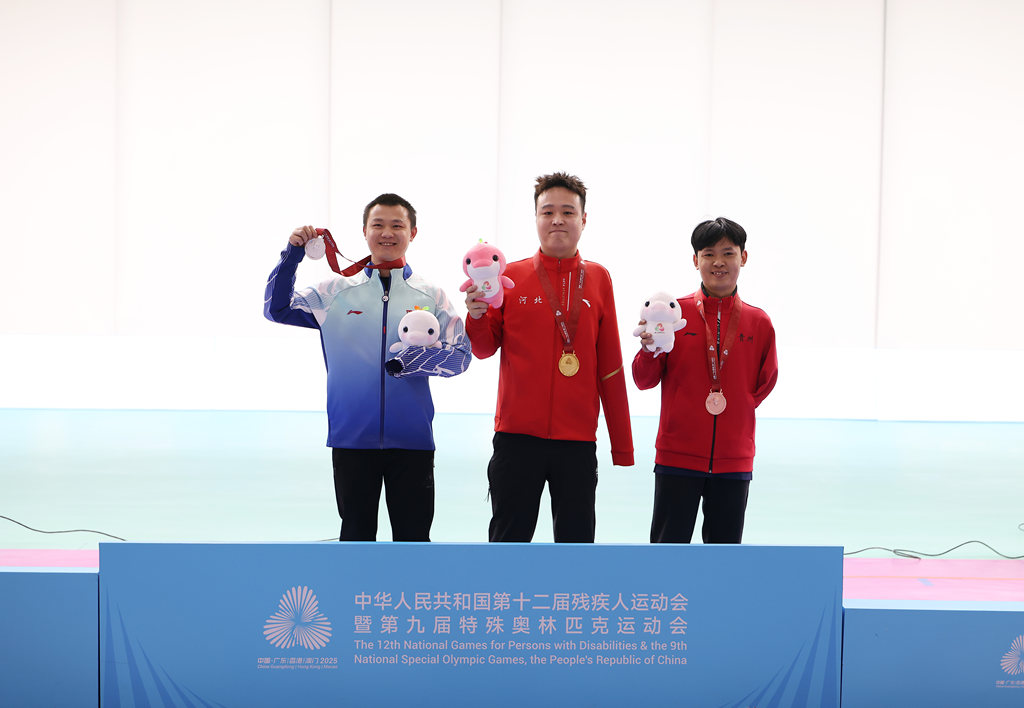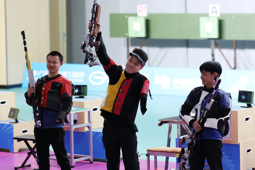 11月29日,杨闯鹏(中)夺得SH2级混合10米气步枪立射金牌。