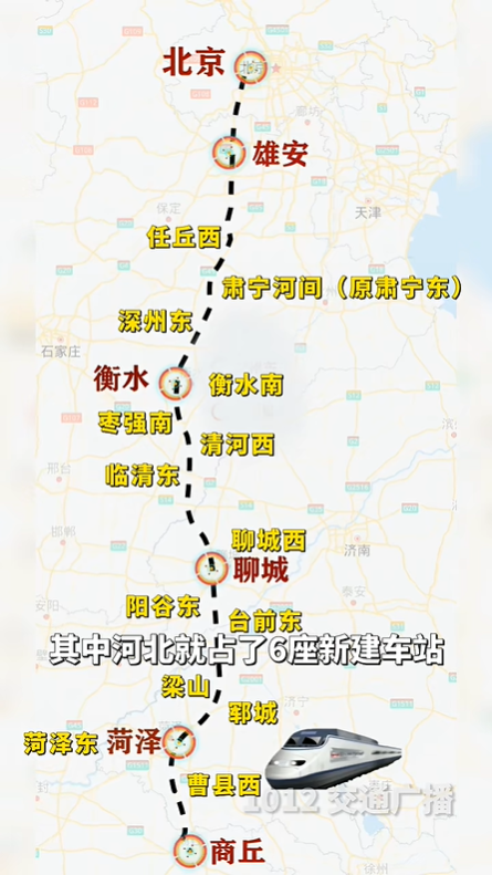 京港高铁雄商段北起京雄城际雄安站,向南经衡水、聊城、菏泽等地至商丘市,正线全长552.5公里。全线设雄安、任丘西、肃宁东、深州东、衡水南、枣强南、清河西、临清东、聊城西、阳谷东、台前东、梁山、郓城、菏泽东、曹县西、商丘16座车站。其中雄安和菏泽东2座车站为既有车站,梁山、郓城、商丘3座车站为改扩建车站,衡水南等11座车站为新建车站,其中河北有6座。