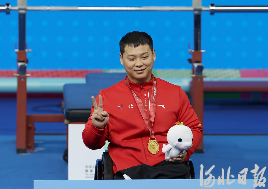 12月1日,在全国第十二届残运会举重比赛上,河北运动员齐勇凯获得男子59公斤级最佳重量冠军和总重量冠军。河北日报记者史晟全摄