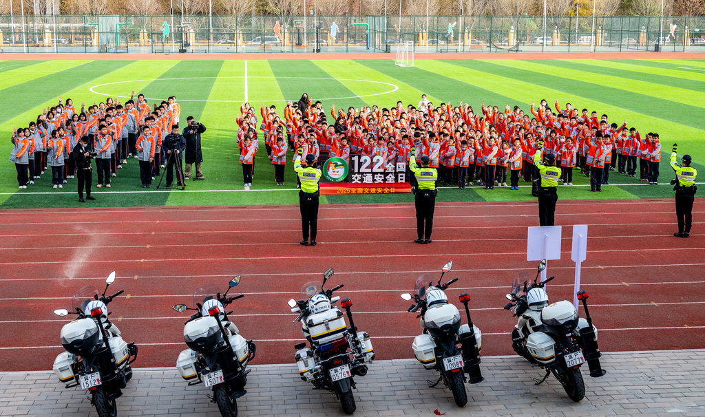 11月28日,保定市新秀学校学生在公安交警的指导下学习交通指挥手势。
