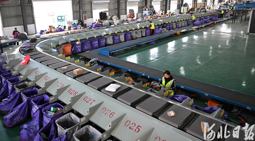 近日,在大名县“一品一播”产业园快递物流配送仓,工人在智能化分拣线上工作。河北日报记者赵永辉摄