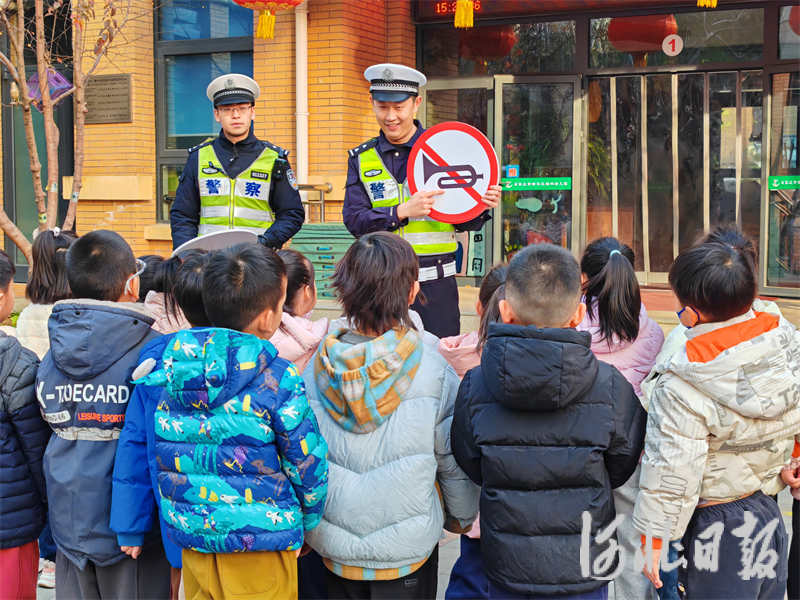 12月1日,石家庄市公安局交通管理局新华交通管理大队民警在石家庄市新华区柏林幼儿园教孩子们识别交通标识。