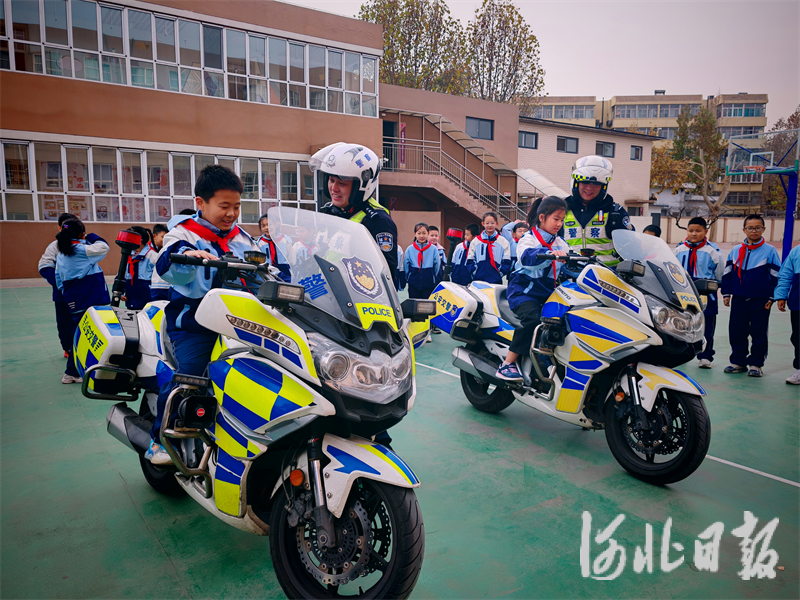 12月1日,在石家庄市天苑小学,学生们体验警用摩托车。