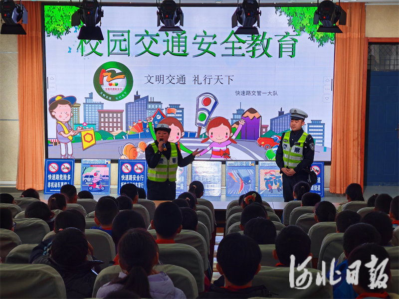 12月1日,石家庄市快速路交管一大队民警在石家庄市自强小学为学生宣传交通法规。