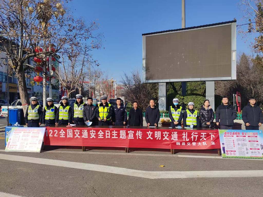 12月2日是第十四个“全国交通安全日”。为增强群众的交通安全意识,培育“人人抵制交通违法、人人践行文明交通、全社会共享文明交通”的良好风尚,2日上午,邯郸交巡警魏县大队联合县文明办、县委网信办、县教育局、县司法局、县交通运输局和县应急管理局等单位在三角公园开展“文明交通、礼行天下”主题宣传活动。