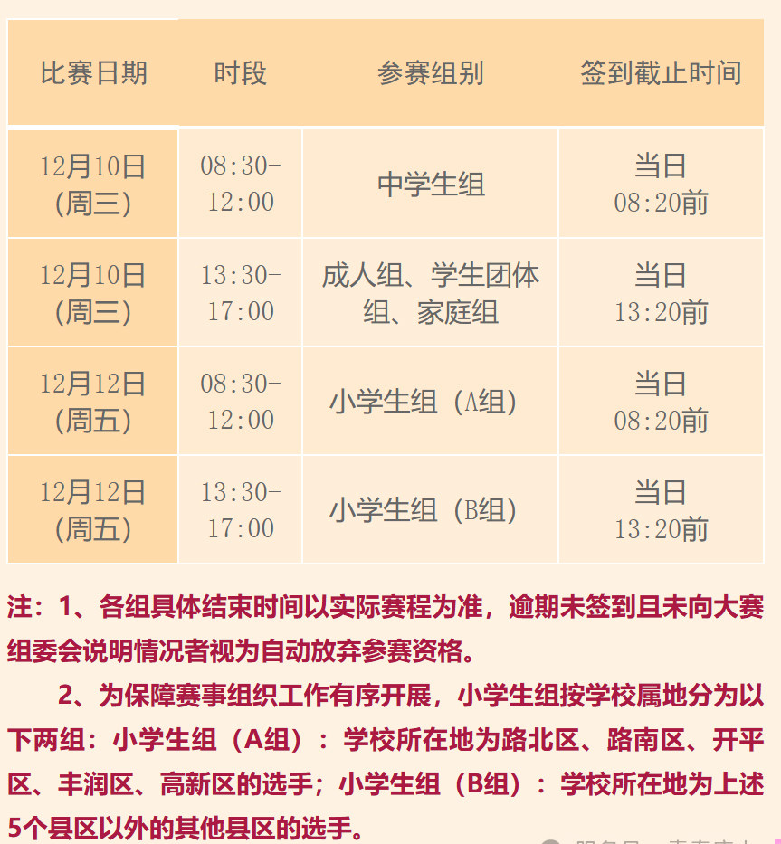 5.如遇不可抗力因素需调整赛程,将通过官方平台或电话提前通知,请选手密切关注相关信息。