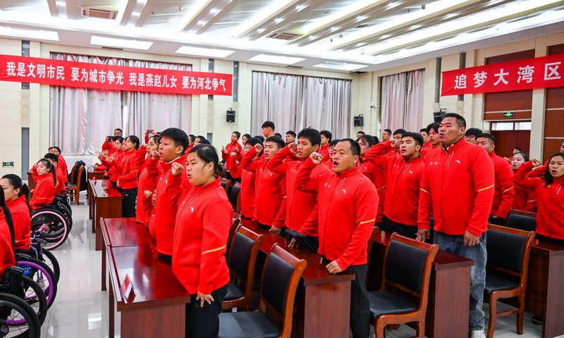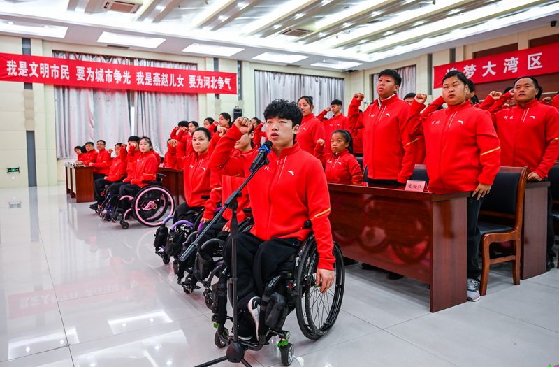 12月3日,河北省残疾人运动员在出征动员大会上郑重宣誓。