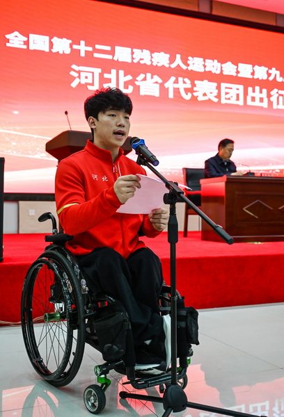 12月3日,河北省残疾人运动员屈子墨在出征动员大会上发言。