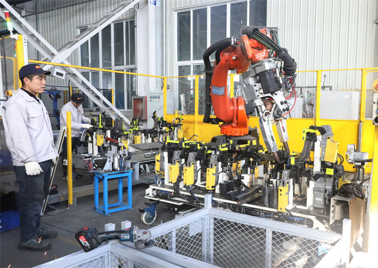 图为在廊坊福亚达汽车车身模具有限公司车间内,机器人工作站正在生产汽车零部件。陈放 摄