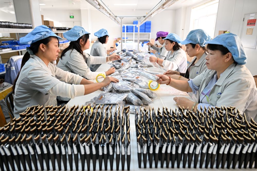 ↑12月4日,河北省青县一家化妆刷生产企业的员工在车间内包装化妆刷。