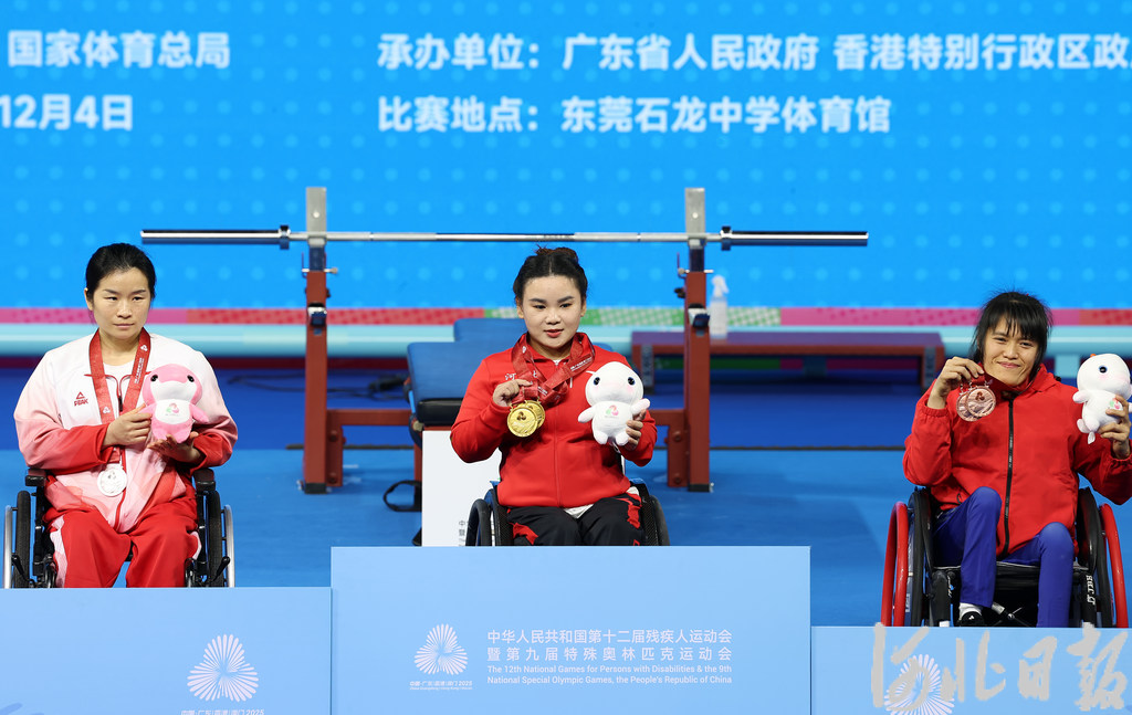 11月30日,在全国第十二届残运会举重比赛中,河北运动员郭玲玲(中)获得女子45公斤级最佳重量冠军和总重量冠军。 河北日报记者 史晟全摄
