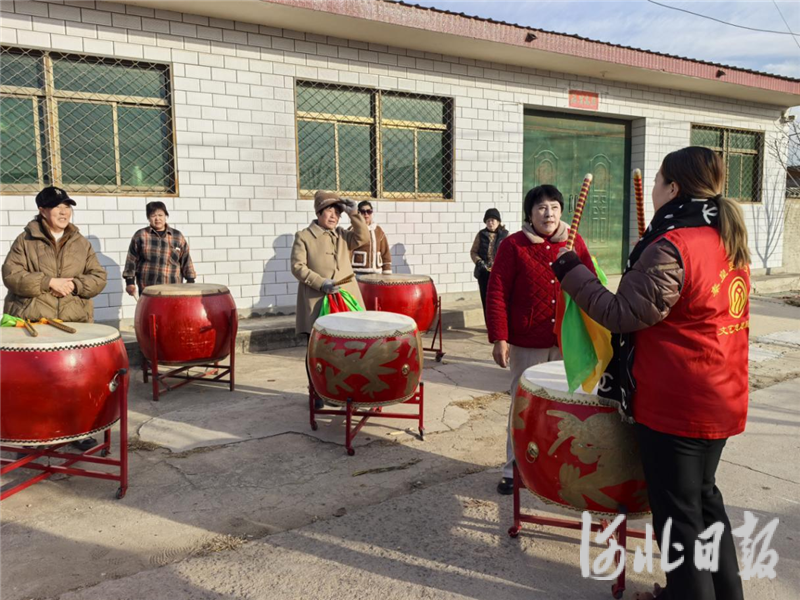 图为文化志愿者正带领村民排练鼓乐节目。马爱萍摄