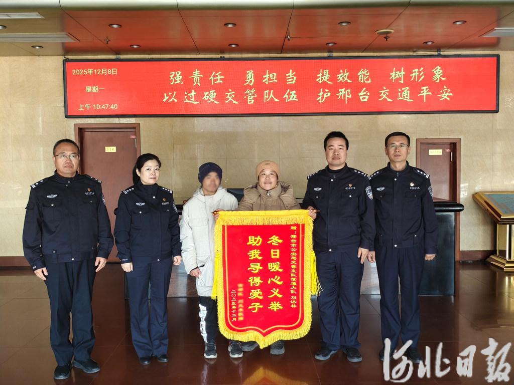 河北日报客户端讯(闫德见、崔信行)12月8日上午,市民刘大姐眼含热泪向邢台市公安局交管支队送上锦旗。这面满载情感的锦旗背后,是一场民警主动关切、多方同心协力寻找走失孩子的暖心行动。