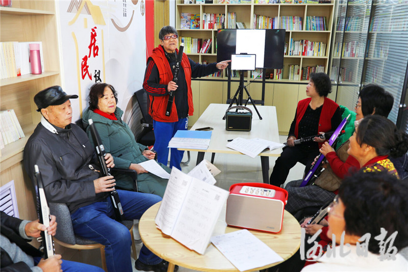 10月21日,在张家口市桥东区商务街社区活动室内,几位老人在学习演奏电吹管。岑屹摄