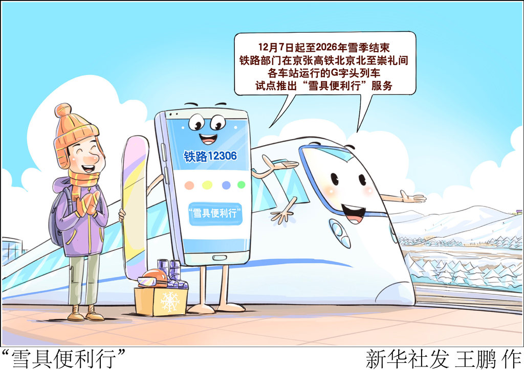 12月7日起至2026年雪季结束,铁路部门在京张高铁北京北至崇礼间各车站运行的G字头列车试点“雪具便利行”服务,铁路12306客户端同步上线“雪具便利行”功能。旅客线上预约成功后,可随车携带雪具并存放在列车指定位置,实现人和雪具随车同行。同时,京张高铁部分车站继续提供“雪具快运”服务,“坐着高铁去滑雪”将更加方便快捷。(据《人民日报》12月8日报道)
