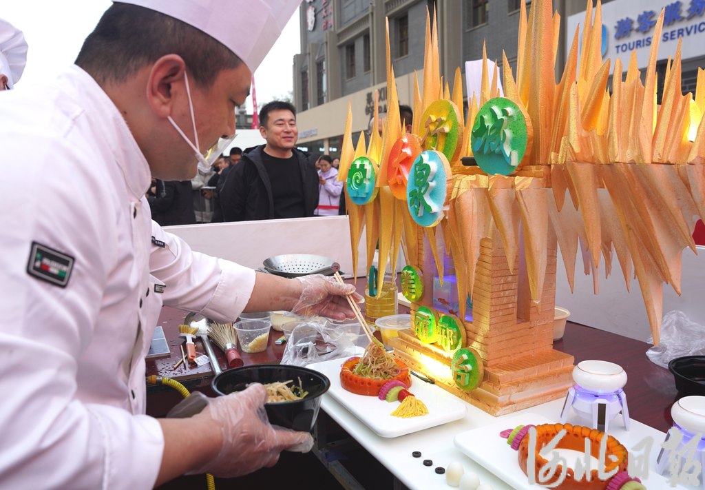决赛现场,选手们身着统一工装,精神抖擞地站在操作台前。随着比赛的开始,大家迅速投入“战斗”:切菜、起锅、热油、下料,动作行云流水、一气呵成。“做饼丝要切得粗细均匀,炒的时候要‘颠三颠、翻三翻’,才能保证根根分明不粘连。”做焖饼40年的巨鹿选手付占平师傅一边快速翻炒,一边向围观市民分享秘诀。