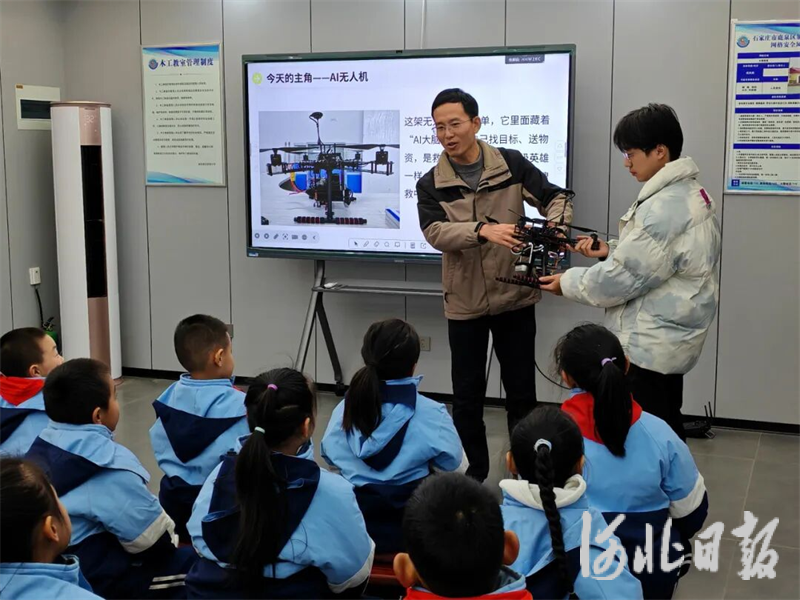 河北日报客户端讯(贡晓红)近日,石家庄市鹿泉区铜冶镇北故邑小学组织开展人工智能科普活动,邀请河北科技大学电气工程学院测控飞设系副教授邵士凯,为同学们带来主题为“从救援无人机看AI的魔力”的人工智能科普宣讲。