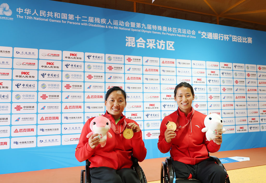 12月10日,河北运动员周洪转(左)在女子400米T53级比赛中。