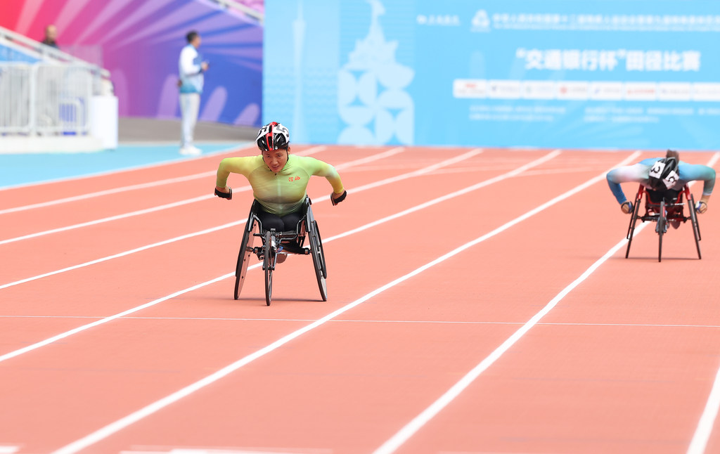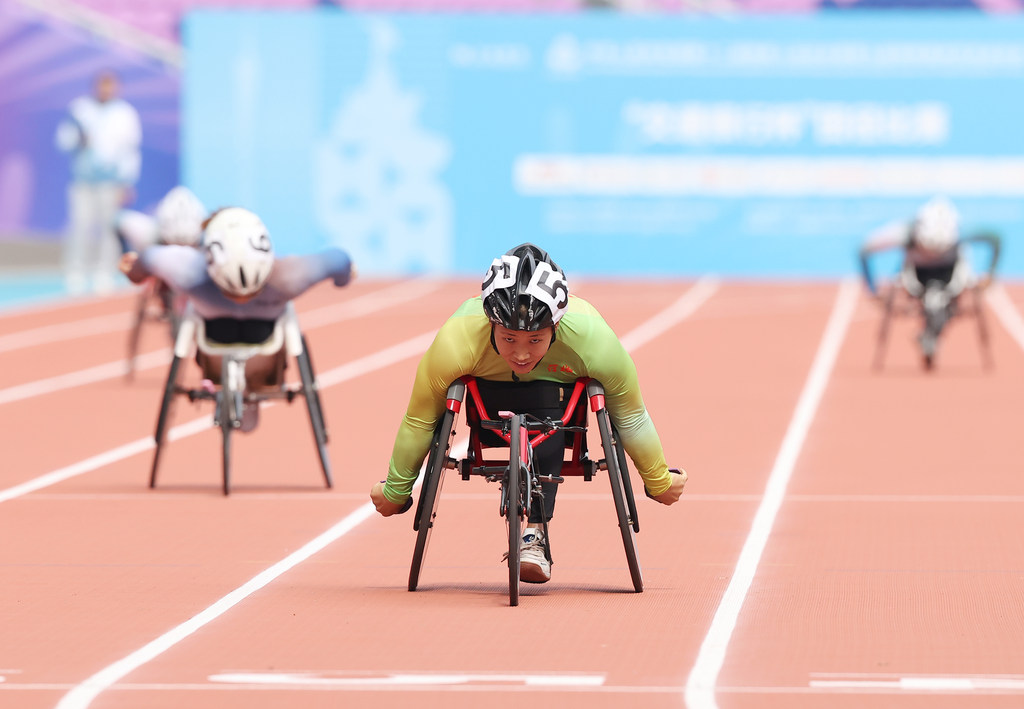 12月10日,河北运动员周洪转在女子400米T53级比赛中。