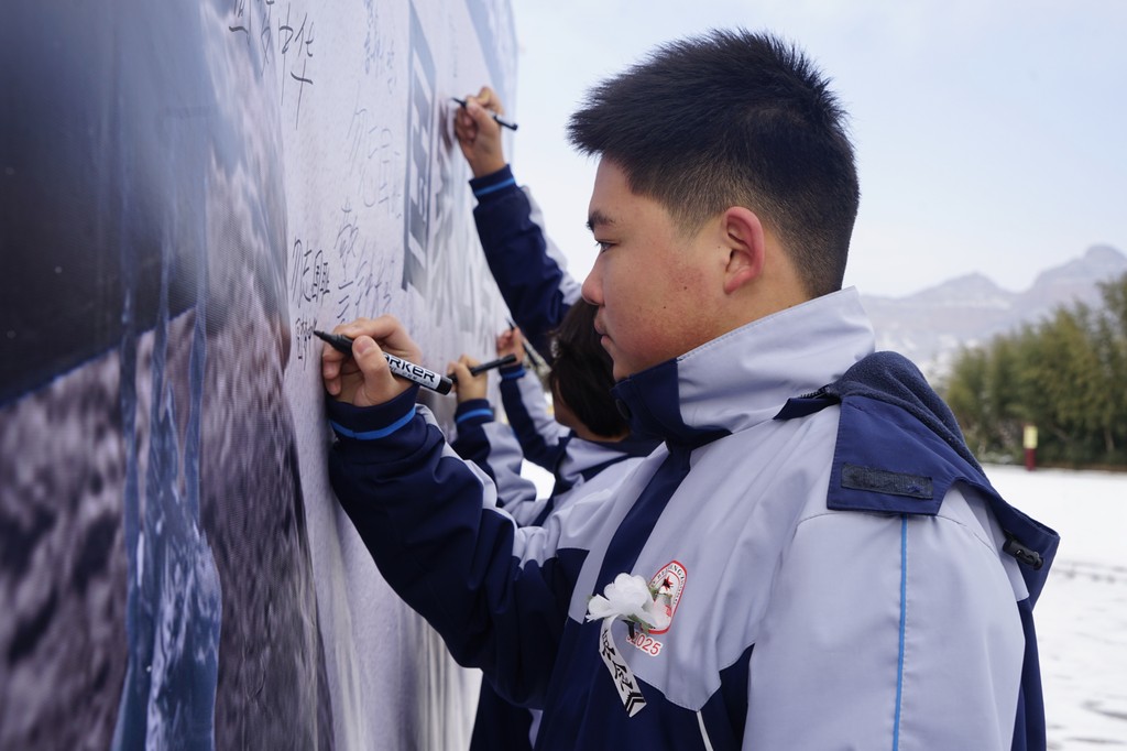 12月13日,邢台市浆水中学学生在和平许愿墙上留下美好祝愿。