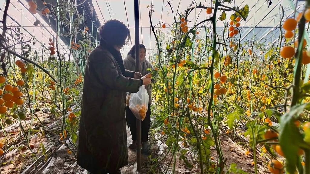 图为游客正在棚内采摘。