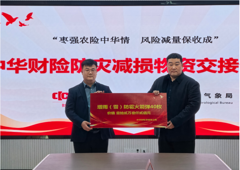 2025年,中华财险枣强支公司与枣强县气象局进行防灾减损物资交接。